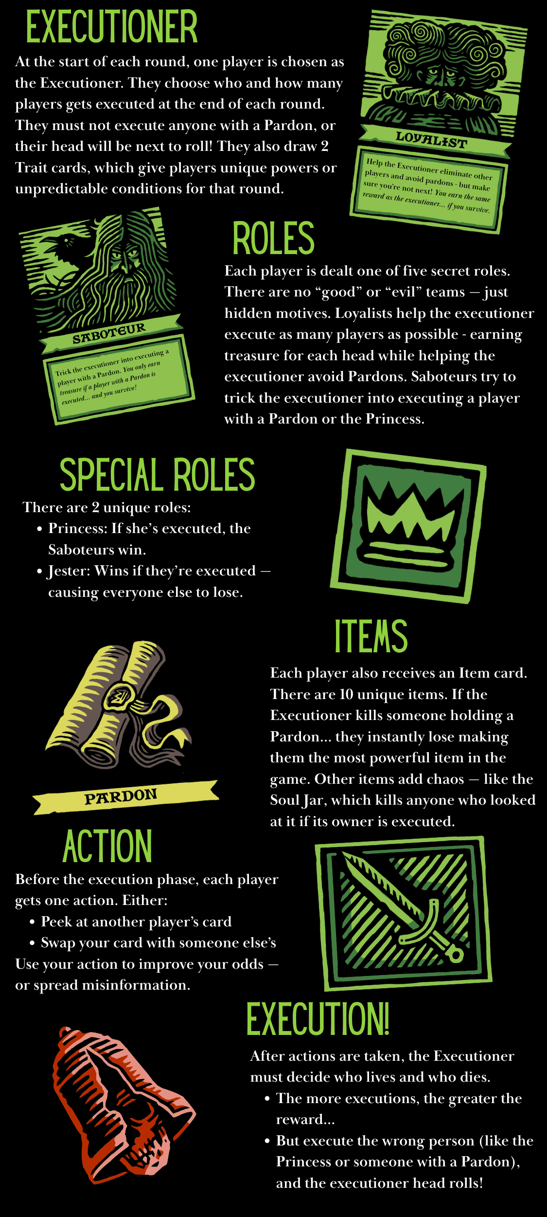 By Order of the King is an upcoming medieval social deduction game. After an attempted mutiny, the King has tasked the executioner with removing the heads of his entire court! Players attempt to survive while the executioner tries to deduce who to execute. The mutineers have forged pardons and distributed them among the prisoners. If the executioner kills a pardoned player, it'll be the executioner's head next to roll. While the Saboteurs try to sabotage the executions, Loyalists try to help the executioner avoid disaster (while saving their own heads of course)! Unlike other social deduction games, there's no "innocent" role or "bad guy" role. Everyone's out for themselves trying to trick the executioner, save their skin, and fulfill their secret role objectives.