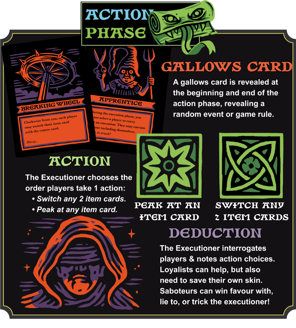 The action phase facilitates players to take an action. Peak at or switch any item card. The Loyalists should be trying to peak at cards to help the executioner. But if they have a weak item, they may want to take a chance and blindly switch their card. Saboteurs should be trying to deduce where the pardon is, and trick the executioner into executing that player. Or, they could try to get a strong item, like the shield to execute the pardon themselves! The Executioner meanwhile is watching everything, and can control the pace of the game, stopping to interrogate players, and choose the order players take an action.