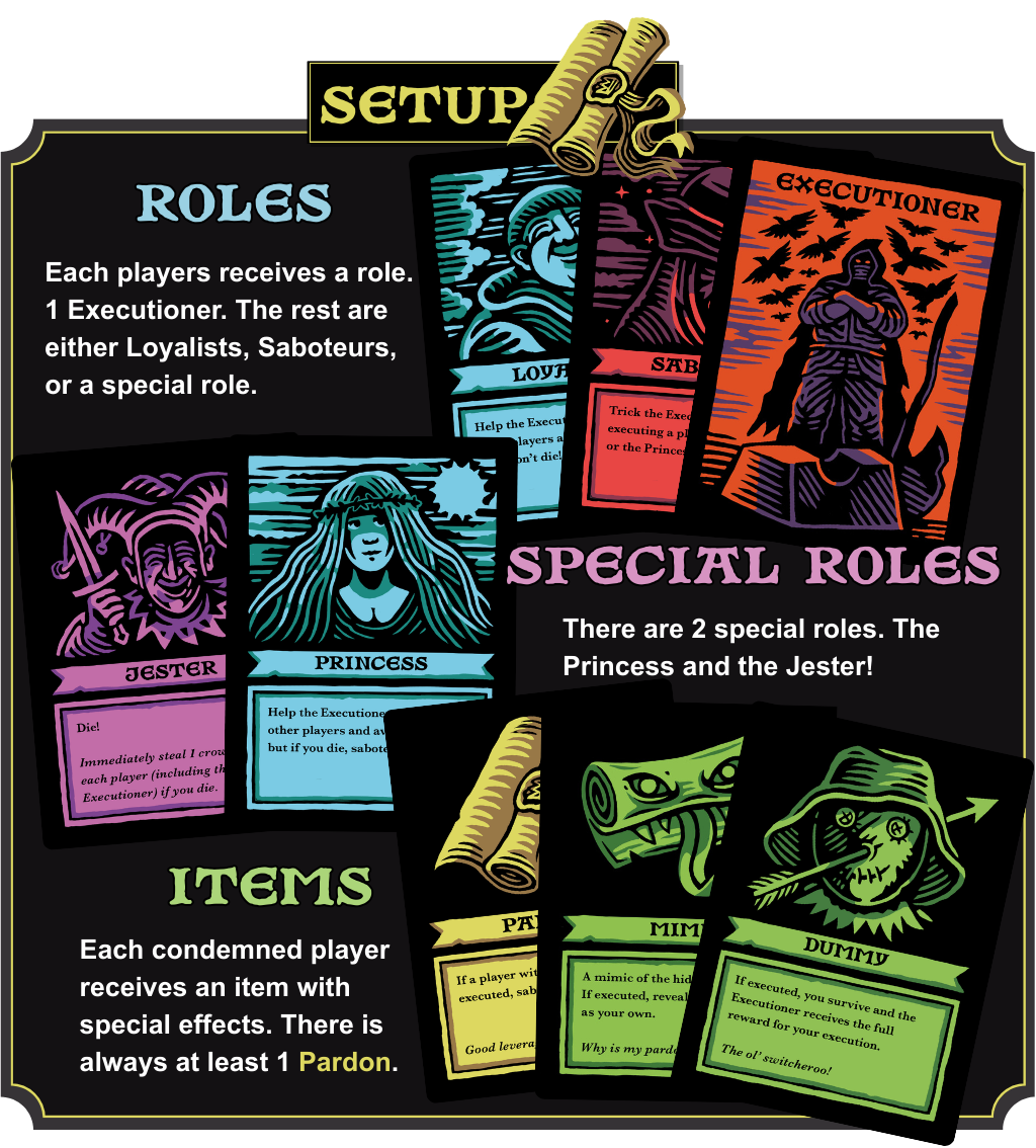 In By Order of the King, each player will find themselves standing before the executioner with just a role card and item card. A "gallows card" will first be played by the executioner, deciding on a random game rule or event with a suitably gruesome execution method! Then, players will have 1 action. They can either peak at any card on the board, or switch any 2 cards. This might be your one chance to steal a powerful item - if you believe the player who claims to have it! Or, you could peak at a card and either lie or inform the executioner about what item a player has. Then, the executioner starts executing! More players = more reward! But they must be careful, if they execute a player with a pardon or the Princess, the saboteurs take the gold, and the executioner's head is on the one that rolls!