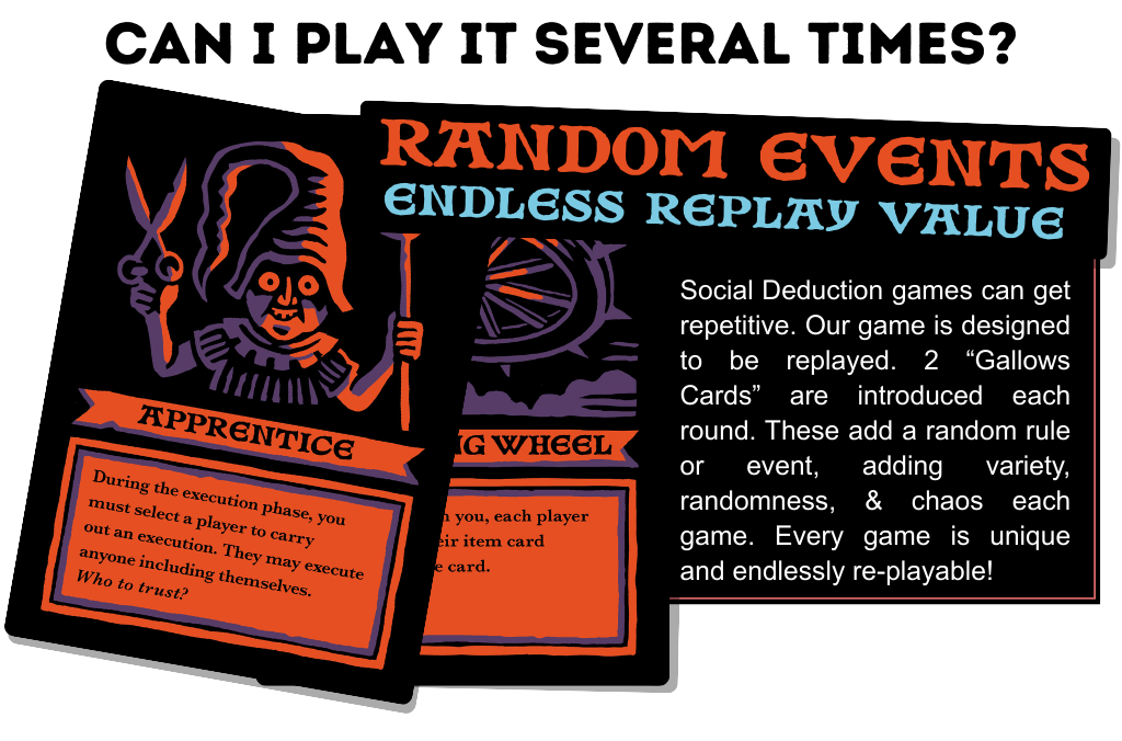 Players only get to look at their own item card at the beginning of the game, meaning the value of cards is dictated by who the executioner believes is telling the truth! Players get one chance to peak or switch item cards. Each item card has a unique effect upon execution, causing chaos!