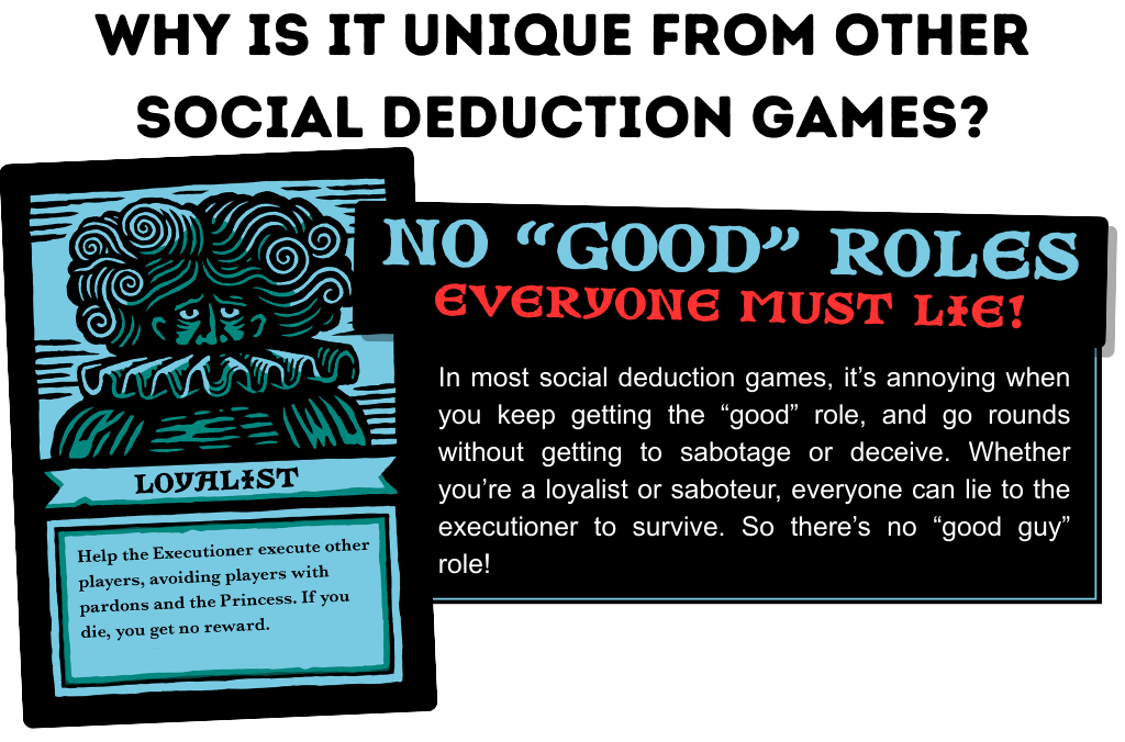 Inspired by other social deduction games like One-Night Werewolf, Secret Hitler, Avalon, Among Us, and Mafia, we noticed one flaw in all of them! It is sooo annoying when you keep getting the "good" role. We don't play social deduction to be honest and virtuous! We wanted a game where, no matter your agenda, you can always lie! While the loyalists need to help the executioner, earning money for each successful execution, they also need to survive themselves! Lie, deceive, and lie some more to survive the executioner's wrath, no matter your role!